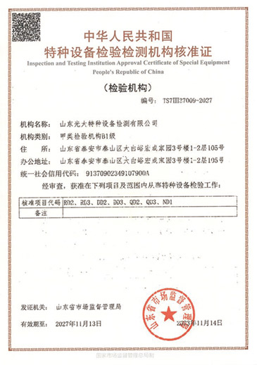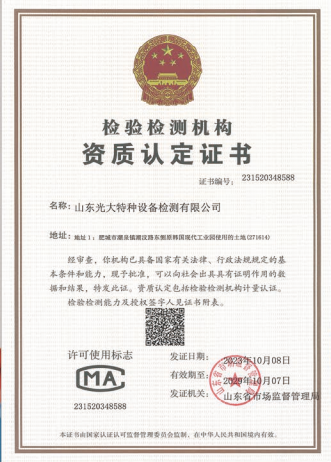 山東光大特種設(shè)備檢測(cè)有限公司是經(jīng)山東省市場(chǎng)監(jiān)督管理局核準(zhǔn)的甲類(lèi)B1特種設(shè)備綜合檢驗(yàn)機(jī)構(gòu)。2017年9月30日取得了山東省市場(chǎng)監(jiān)督管理局頒發(fā)的《檢驗(yàn)檢測(cè)機(jī)構(gòu)資質(zhì)認(rèn)定證書(shū)》。2018年2月22日取得了山東省市場(chǎng)監(jiān)督管理局頒發(fā)的《特種設(shè)備檢驗(yàn)檢測(cè)機(jī)構(gòu)核準(zhǔn)證》(起重機(jī)械)檢驗(yàn)檢測(cè)資質(zhì)。2021年11月取得山東省市場(chǎng)監(jiān)督管理局版發(fā)的《特種設(shè)備檢驗(yàn)檢測(cè)機(jī)構(gòu)核準(zhǔn)證》(安全閥在線(xiàn)、離線(xiàn))校驗(yàn)資質(zhì)。2023年11月取得山東省市場(chǎng)監(jiān)督管理局頒發(fā)的甲類(lèi)檢驗(yàn)機(jī)構(gòu)B1《特種設(shè)備檢驗(yàn)檢測(cè)機(jī)構(gòu)核準(zhǔn)證》,具有壓力容器(RD2...